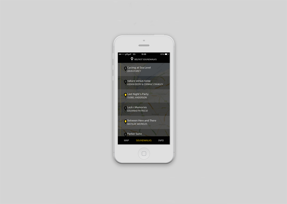 The Belfast Soundwalks App was a geolocation app developed at the Sonic Arts Research Centre, Queen’s University Belfast, between March and August 2013 and in collaboration with the the Belfast City Council. The project was funded by the Arts and Humanities Research Funds.