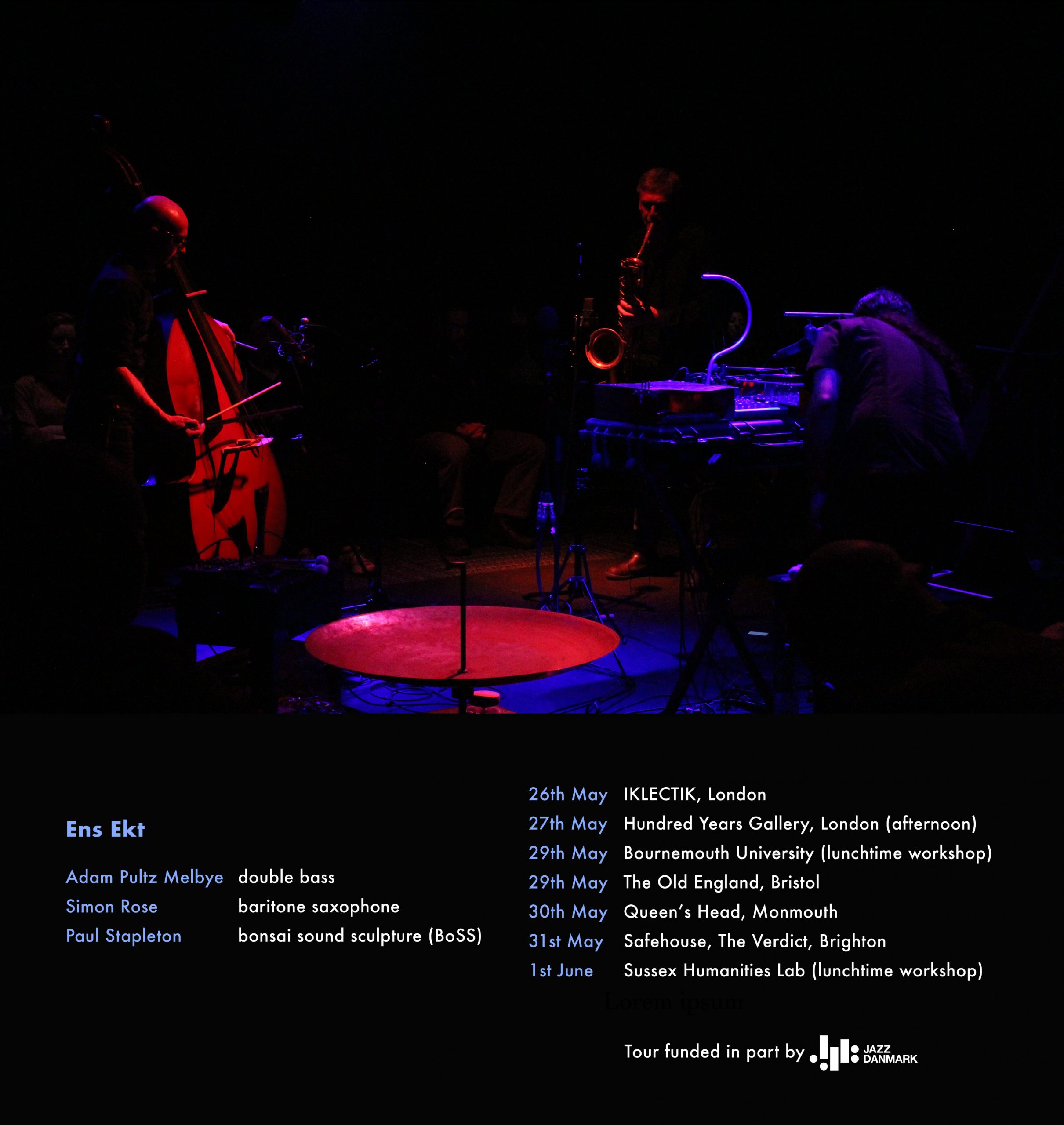 Ens Ekt features the experimental musical inventions of Paul Stapleton (Californian born, Belfast-based) placed in dialogue with the circular breathed multiphonics and harmonic textures of Simon Rose (English born, Berlin-based) and the resonant gestural and spectrally focused playing of Adam Pultz Melbye (Danish born, Berlin-based).